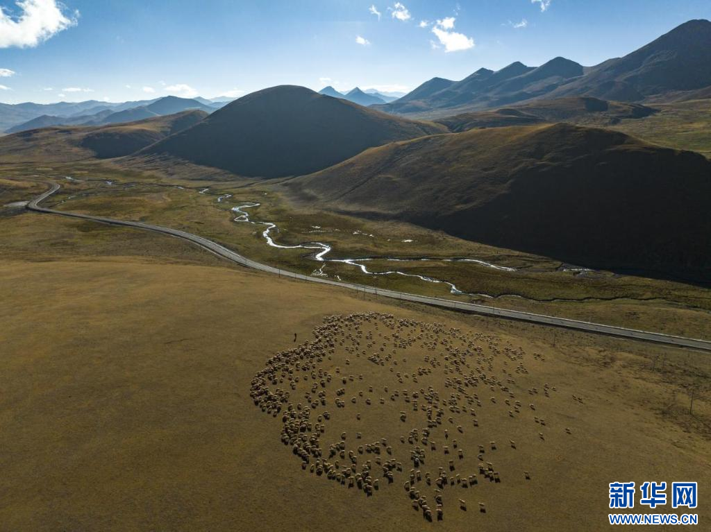 扎西松多村集體養殖的千只綿羊(無人機照片)。新華網 旦增努布 攝