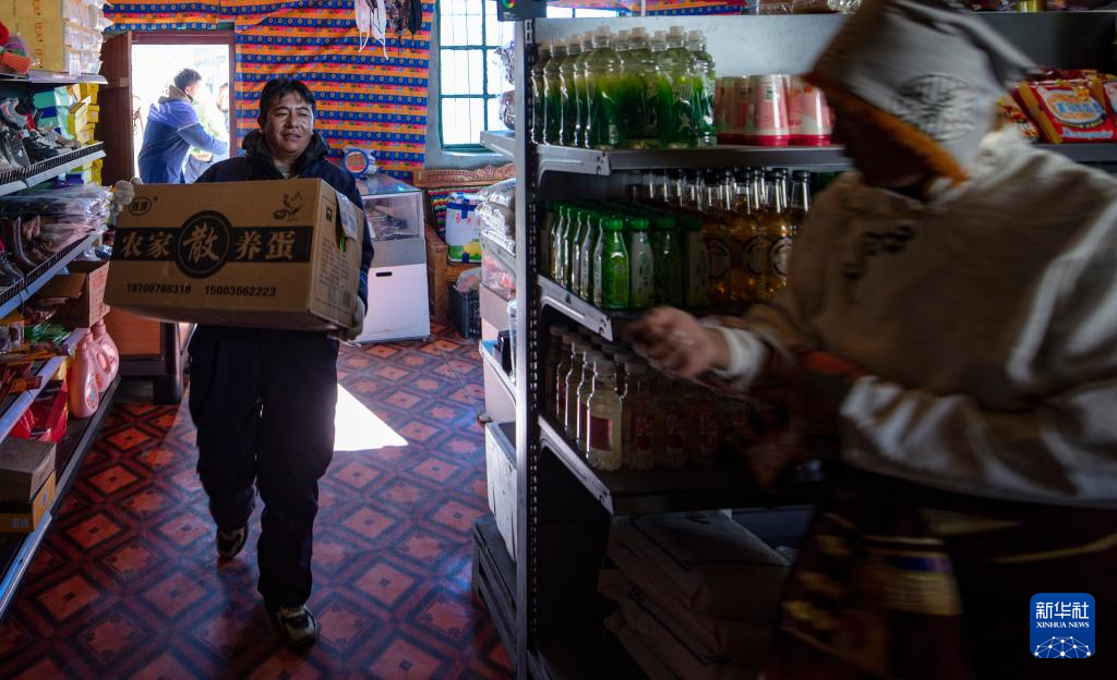 申扎縣供銷合作社的配送員次仁桑珠在縣城總店為馬躍鄉(xiāng)貝嘎四村偏遠(yuǎn)鄉(xiāng)鎮(zhèn)果蔬配送試點(diǎn)項(xiàng)目直銷點(diǎn)上貨(1月5日攝)。新華社記者 曹檳 攝