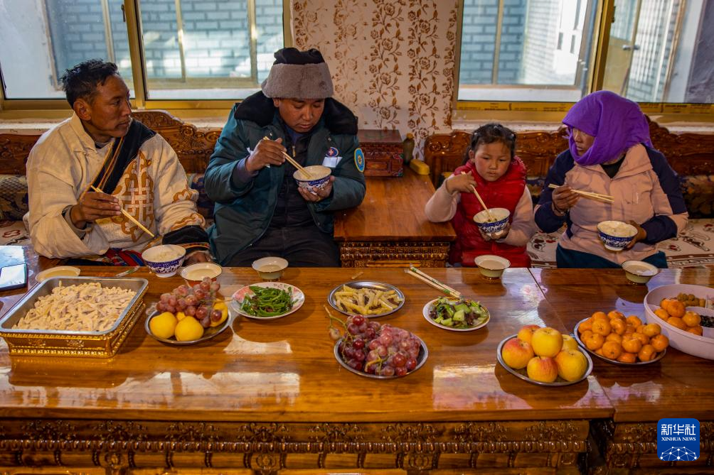 申扎縣馬躍鄉(xiāng)貝嘎四村村民次仁曲達(dá)(左一)家在吃飯,桌上的新鮮蔬菜和水果都是在村里的偏遠(yuǎn)鄉(xiāng)鎮(zhèn)果蔬配送試點(diǎn)項(xiàng)目直銷點(diǎn)采購的,由供銷合作社當(dāng)天配送而來(1月5日攝)。新華社記者 姜帆 攝