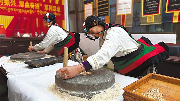圖為:在第三屆“鄉村振興 那曲奮進”農牧民技能大賽中,巴青縣農牧民參賽選手進行手工磨糌粑。 記者 萬靖 攝