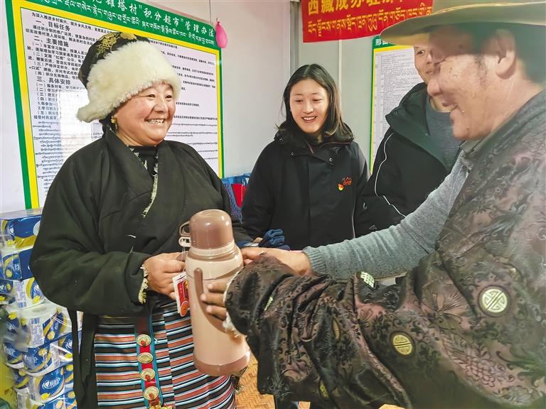 圖為那曲市色尼區(qū)那曲鎮(zhèn)色尼雄塔村村民斯秋多杰(左一)用積分兌換商品。 記者 萬靖 攝