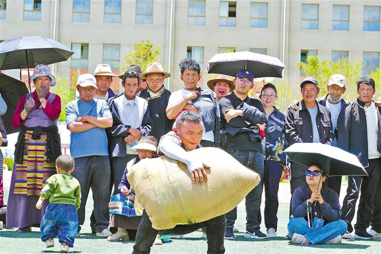 圖為桑珠孜區(qū)城北街道舉辦慶祝第八個(gè)“日喀則市民族團(tuán)結(jié)進(jìn)步日”暨“全民來(lái)健身 健康你我他”社區(qū)運(yùn)動(dòng)會(huì)。這是參賽選手在進(jìn)行抱石頭比賽。