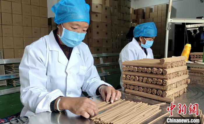 “我們農閑時就會來這里制作藏香?!睅孜宦耦^工作的婦女不善言談,但她們數線香、捆藏香流程十分嫻熟,她們足不出村實現就業增收?! ?/p>