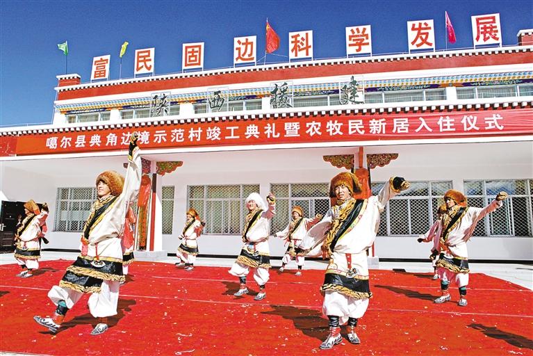 2012年10月,由陜西省援建的阿里地區首個邊境小康示范村——噶爾縣扎西崗鄉典角村竣工。這是入住儀式上,群眾跳起歡快的舞蹈。