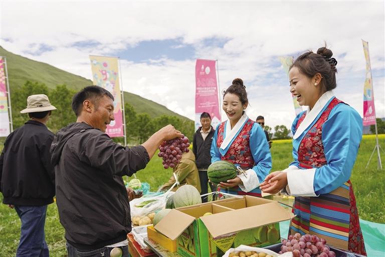 工作人員介紹墨竹工卡縣產的瓜果蔬菜。
