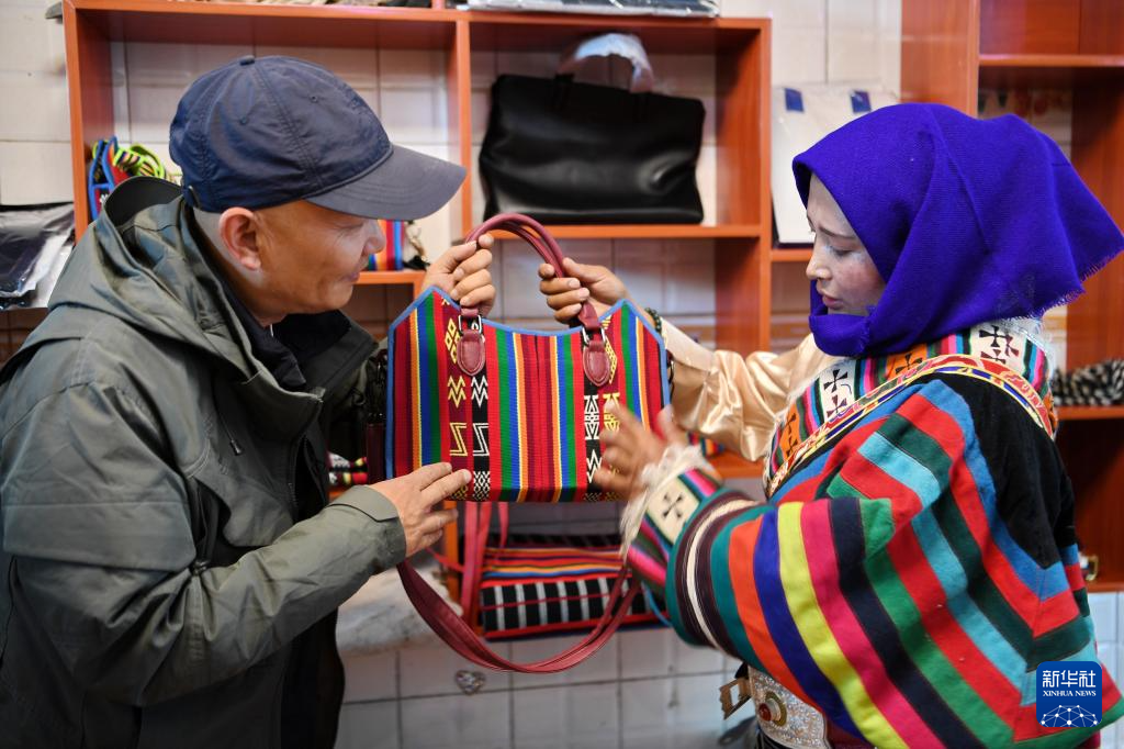 一名來自上海的游客(左)在安多托尕爾倉游牧產業有限責任公司展廳挑選產品(8月24日攝)。新華社記者 張汝鋒 攝