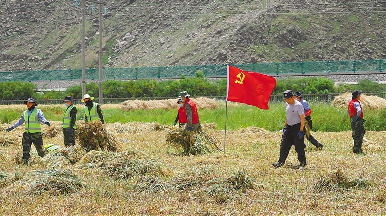 圖為拉薩市堆龍德慶區(qū)古榮護路大隊志愿服務分隊深入田間地頭,幫助農民收割青稞。