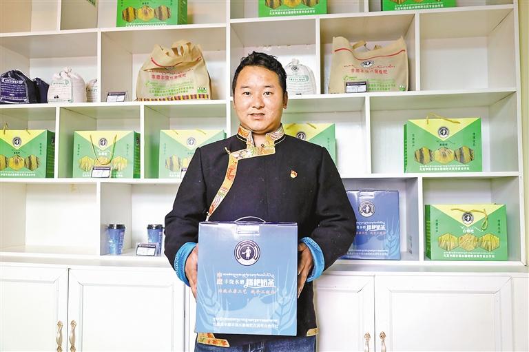 申藏村村民委員會副主任、鄉村振興專干久米旺久展示扎其申藏豐饒水磨糌粑合作社的產品。記者 頓珠扎西 攝