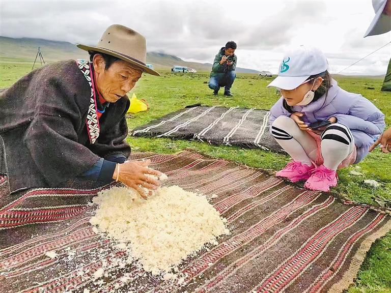 圖為游客在瑪如村觀看當地牧民制作奶渣。記者 丹增平措 攝