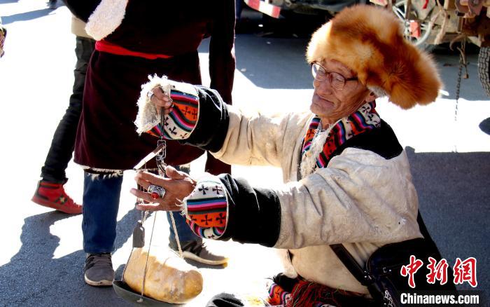圖為申扎縣畜產(chǎn)品展銷會(huì)現(xiàn)場上,牧民正出售酥油。(資料圖)那曲市申扎縣委宣傳部供圖