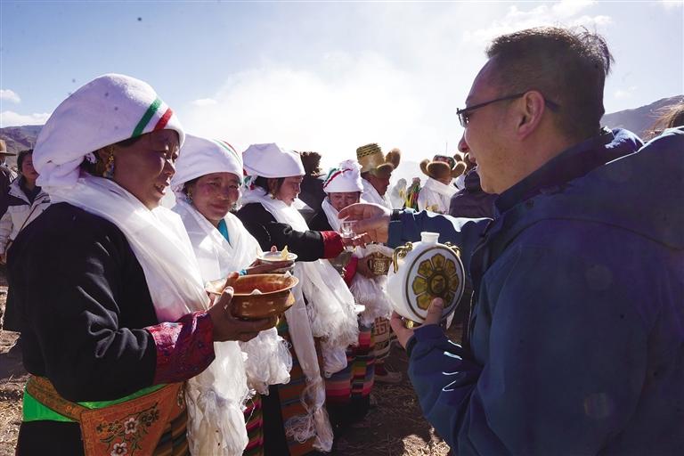 活動中,村民們身著節日盛裝,手捧象征五谷豐登的“切瑪”,唱起祈愿歌,互敬青稞酒,共同祈愿新的一年豐收。隨著鐵犁翻開土地,婦女們將手中的種子撒下,寄托著對豐收的殷切期望。政府領導、企業代表和村民們齊聚一堂,共同見證了這一充滿希望的農事活動,同時也迎來了推動鄉村發展的重要時刻。