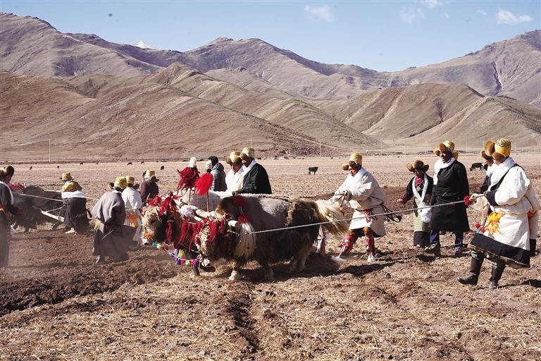 3月16日,西藏阿拉嘉寶酒業第十屆開耕節暨林周縣春堆鄉春播儀式成功舉辦,活動現場熱鬧非凡,村民沿襲傳統,使用二牛抬杠翻土犁地。