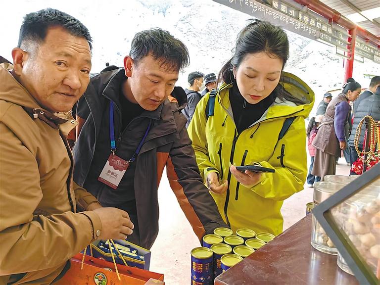 圖為嘉黎縣尼屋鄉桃花節期間,游客爭相購買特色農產品。記者 趙書彬 攝