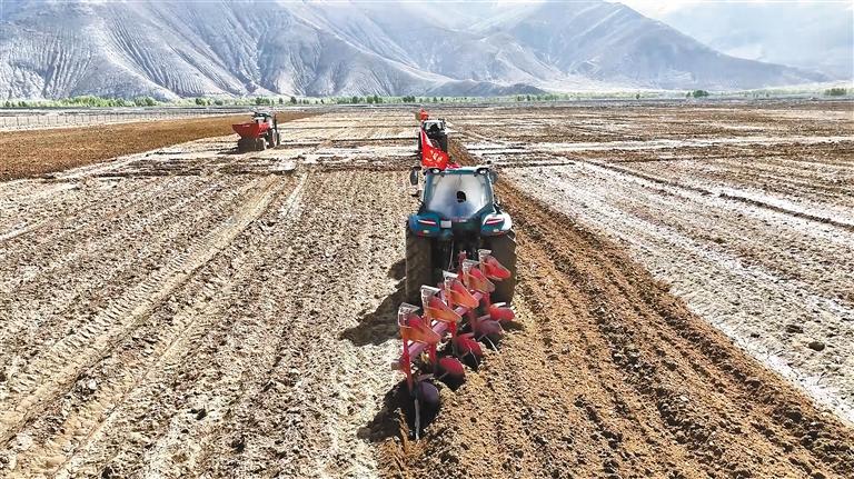 圖為播種機在田間作業。記者 旦增嘎瓦 攝