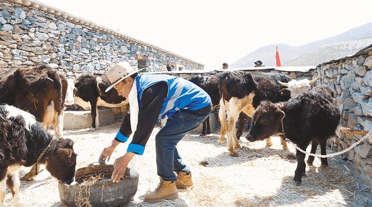村民在新建的集中飼養牛圈里照料牲畜。