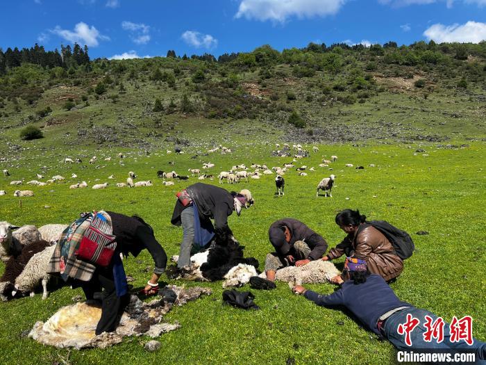阿木姐弟(右二、右三)加入到剪羊毛的隊伍。時文枝 攝