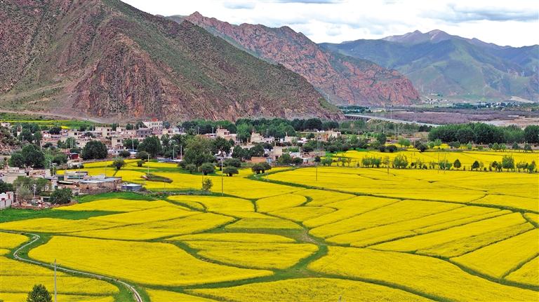 盛夏時節,拉薩市墨竹工卡縣的萬畝油菜花迎來盛花期,金黃色的花海與高原特有的藍天白云相映成趣,構成一幅壯美的自然畫卷。近年來,墨竹工卡縣適度擴大油菜種植規模、舉辦油菜花旅游推介會等,大力發展小菜籽油特色產業,推動產業發展和群眾增收致富。