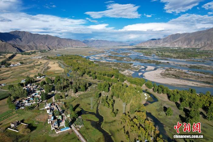 9月20日,拉薩河畔神秘樹林風光,據悉該樹林以前為荒灘。(無人機畫面)中新社記者 江飛波 攝