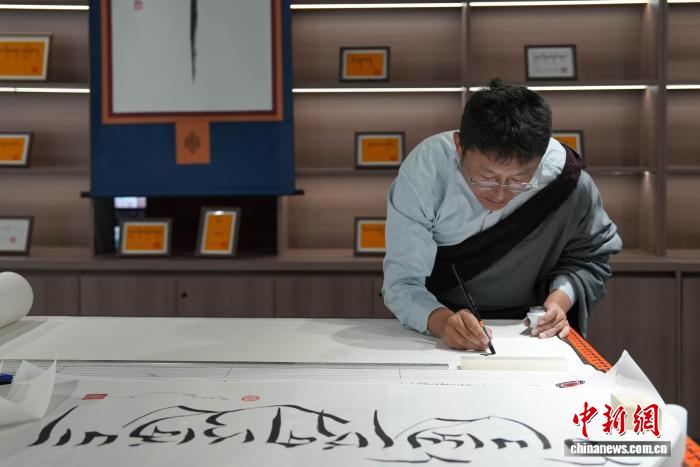 圖為西藏鄉村振興產品展示中心內的藏文書法體驗區。貢確 攝