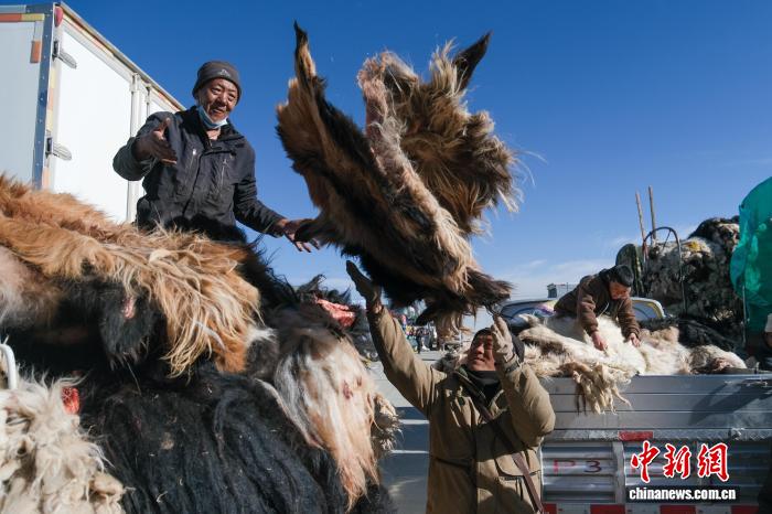 12月15日,西藏自治區那曲市第十八屆畜產品展銷會上,牧民在整理待售的羊皮。中新社記者 江飛波 攝
