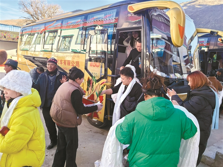 拉玉鄉(xiāng)強(qiáng)吉村來自全國(guó)各地的“冬游西藏”百人團(tuán)游客。