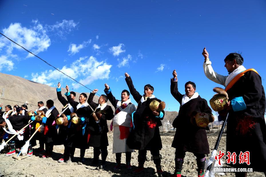 3月16日,西藏山南市瓊結縣瓊結鎮白日社區舉行一年一度的春耕祈福儀式。村民們身著盛裝,手捧哈達、青稞酒齊聚田間。裝點經幡與彩旗的拖拉機列隊駛入耕地,婦女們緊隨播種。互敬青稞酒、拋灑糌粑等傳統習俗一應俱全,古老農耕傳統與現代農機作業相融,村民祈愿風調雨順、五谷豐登。圖為白日社區居民正在祈福風調雨順。