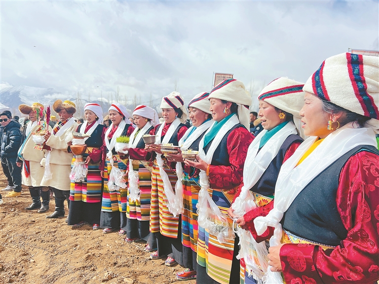 春耕春播儀式上,村民們高舉青稞酒,唱響吉祥歌,祈愿五谷滿倉、農事順遂。記者 央金 攝