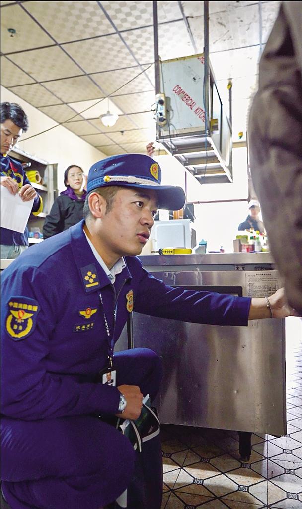 消防人員檢查餐飲店防火設施器材是否完好。