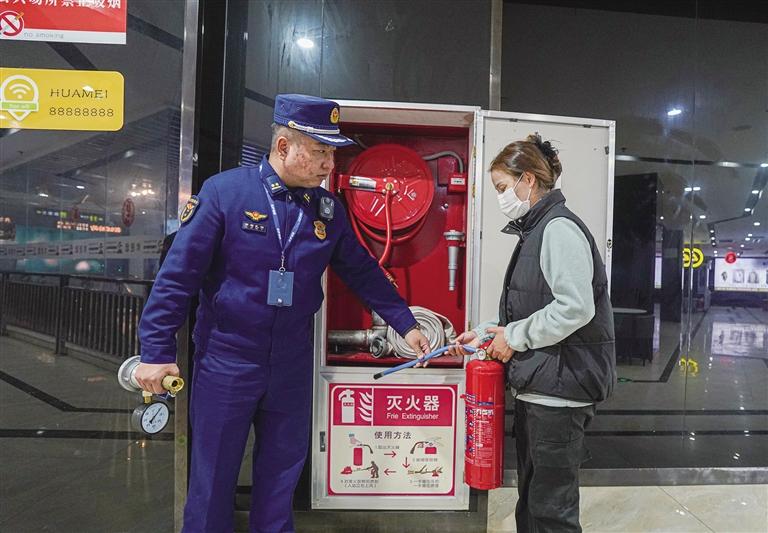 消防人員檢查華美巨幕影城滅火器配置數量。
