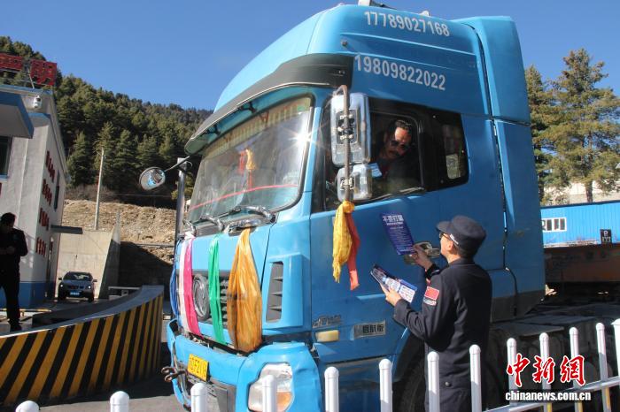 圖為西藏邊檢總站執法調查支隊民警向過往車輛駕駛員開展宣傳。西藏邊檢總站執法調查支隊供圖