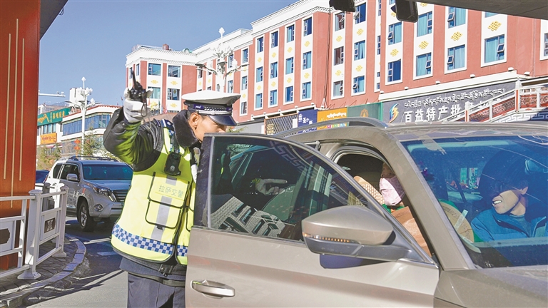 圖為拉薩交警定點值守中。記者 鹿麗娟 攝