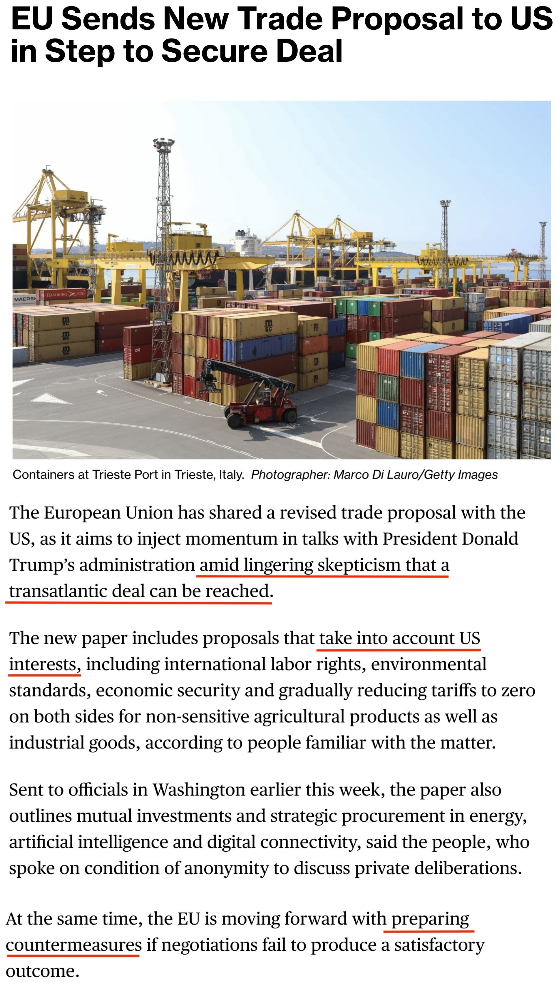 但目前外界對能否達成跨大西洋協議仍持懷疑態度。為此,歐盟同時也在推進反制措施的準備工作,以防談判未能取得令人滿意的結果。