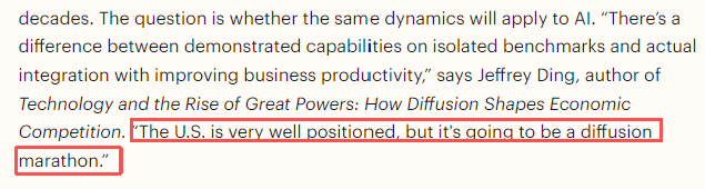正如科技史著作《科技與大國崛起》的作者杰弗里·丁所言:“基準測試表現與實際生產力提升是兩回事。盡管美國現在的位置不錯,但是這是一場持久的馬拉松。”
