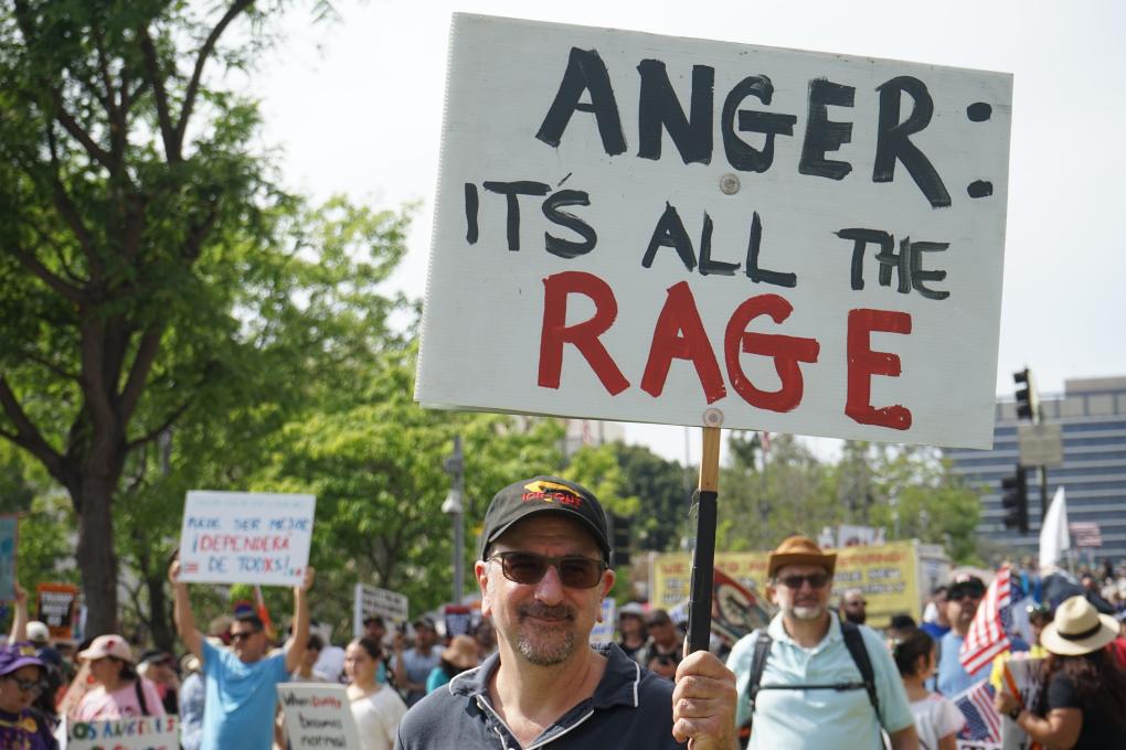3月28日,人們在美國加利福尼亞州洛杉磯參加“不要國王”抗議活動。新華社發(曾慧攝)