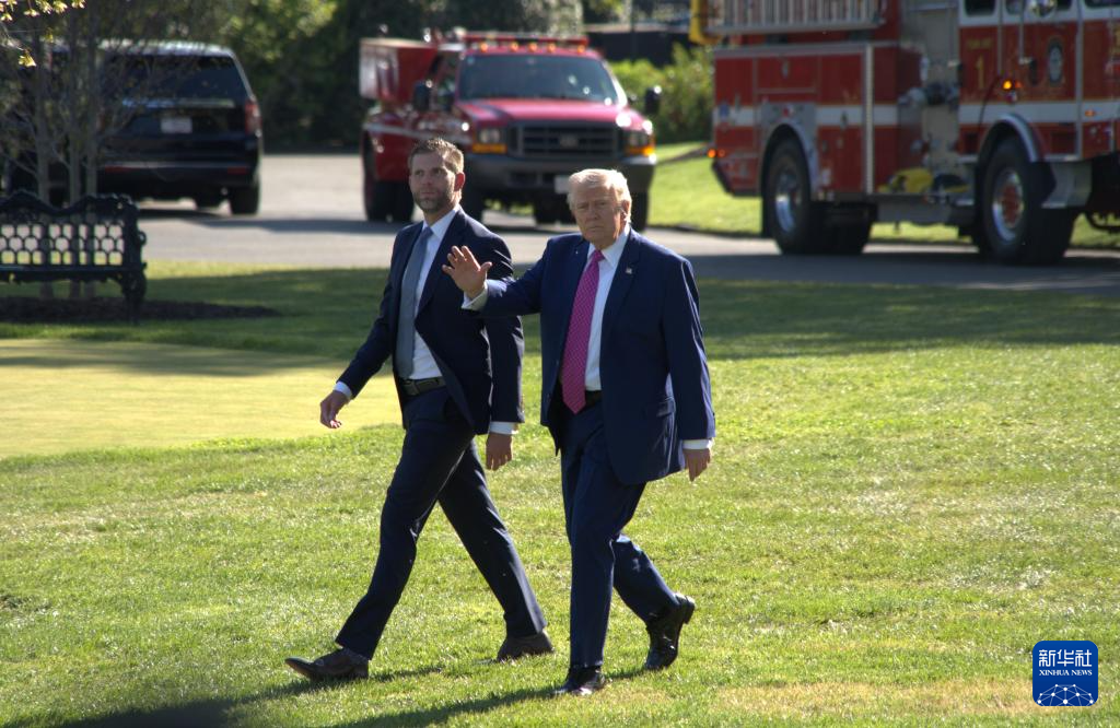 4月10日,美國總統特朗普(右)準備乘直升機離開華盛頓白宮。新華社發(李源清攝)