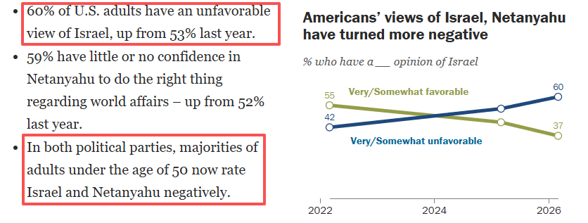 民意層面,皮尤研究中心近期的民調結果顯示,60%的美國成年人對以色列持負面看法,高于去年的53%。無論黨派歸屬,50歲以下成年人中的大多數受訪者對以色列及其總理內塔尼亞胡的評價都是負面的。