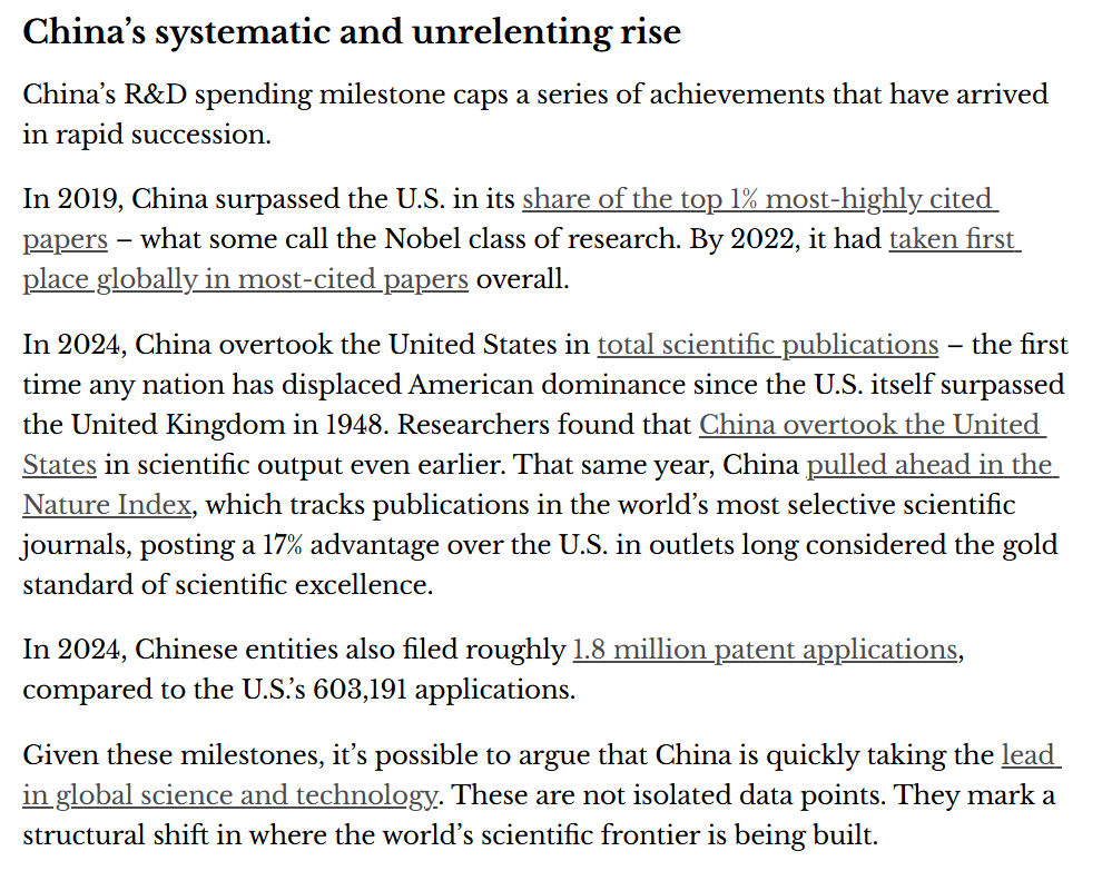 2024年,中國科研論文總量超過美國,這是自1948年美國取代英國以來,首次有國家在科研產出總量上撼動美國長期的主導地位。