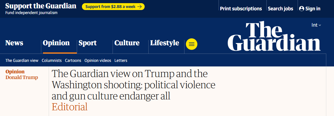 英國《衛(wèi)報(bào)》日前發(fā)表社論指出,美國政治暴力與槍支文化的交織正危害所有人。文章回顧了近日華盛頓希爾頓酒店發(fā)生的槍擊事件,并將其與45年前里根遇刺案相提并論,強(qiáng)調(diào)暴力已成為美國政治傳統(tǒng)中難以根除的頑疾。