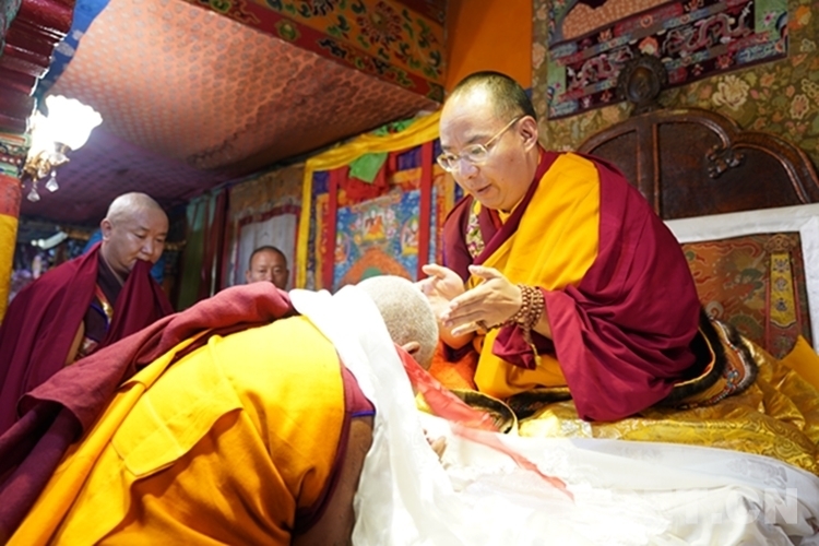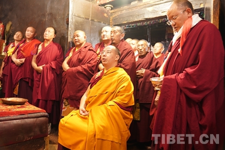 當(dāng)日下午,在扎什倫布寺拉讓日光殿,班禪登上法座,接受扎什倫布寺管委會僧人成員、高僧朝拜,為他們摸頂賜福,并帶領(lǐng)高僧誦經(jīng)祈福。