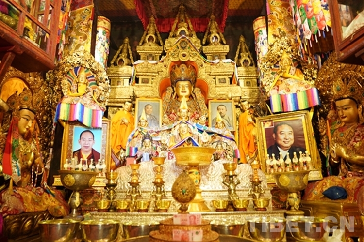 在措欽大殿,班禪虔誠叩拜供奉于此的佛祖釋迦牟尼佛像和藏傳佛教格魯派始祖宗喀巴佛像,與僧眾共同念誦經(jīng)文,之后回到寢宮拉讓殿。