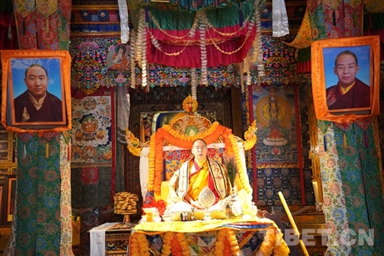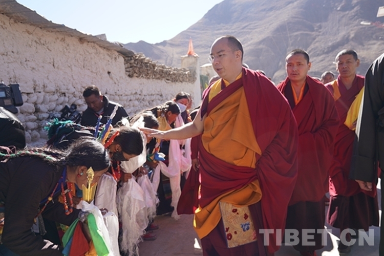 當日12時許,班禪一行抵達日吾其鄉,班禪笑容慈和地一一為等候在寺廟前的信教群眾摸頂,并向表演迥巴藏戲的信教群眾揮手致意。隨后,手持香爐的高僧和吹嗩吶的僧人引路,在手持黃傘的高僧護送下,班禪緩步進入主殿,朝拜大威德金剛拉康,參觀石刻、擦擦文物陳列室后登上大殿寶座,向寺廟僧眾傳授《勝道啟門頌》,為僧眾摸頂。