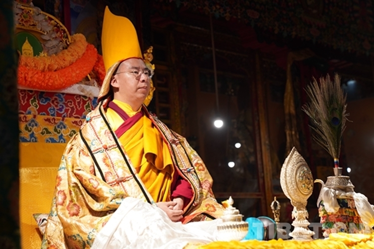 隨后,班禪在瓊布·阿旺強巴堅贊活佛引領下,緩緩進入寺廟主殿。在主殿內,班禪每到一座佛像前都雙手合十為眾生祈禱,并向佛像敬獻哈達,祈求國泰民安、利樂眾生。此時,僧眾也齊聲誦經、虔誠祝禱。禮佛后,班禪登上主殿寶座,向寺廟僧眾傳授《三主要道論》《圣道啟門頌》《兜率百尊上師瑜伽》,并為僧眾摸頂賜福。