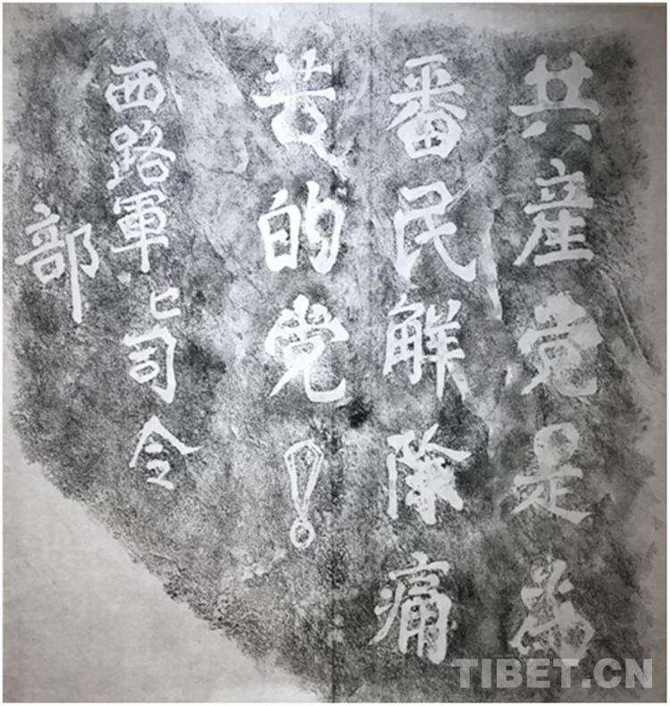 紅軍長征在藏區(qū)留下了諸多遺跡,展覽中的《黑水縣沙石多鄉(xiāng)紅軍標語》(1935年)便是其中一處。據(jù)歷史記載,1935年7月至1936年8月,紅一、四方面軍先后三次駐扎或經(jīng)過四川,黑水(今四川省阿壩藏族羌族自治州黑水縣)藏族群眾曾幫助紅軍熬鹽、籌糧,籌措物資。拓片中赫然醒目的標語見證了這一段歷史:“共產(chǎn)黨是為番民解除痛苦的黨!”