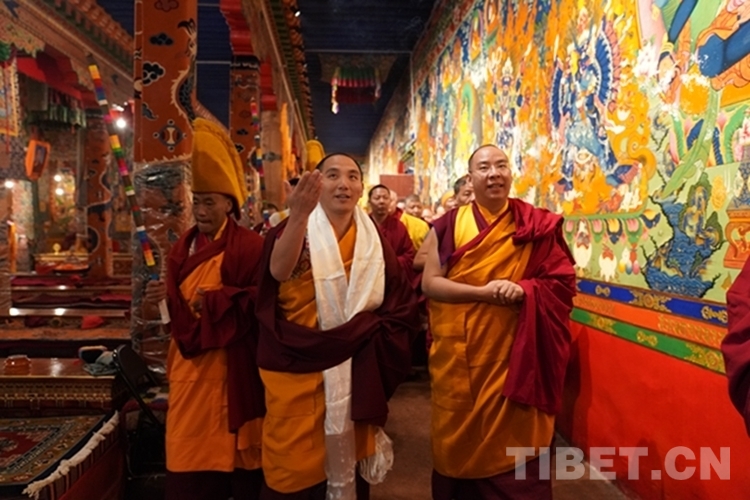 當日12時許,班禪一行抵達日吾其鄉,班禪笑容慈和地一一為等候在寺廟前的信教群眾摸頂,并向表演迥巴藏戲的信教群眾揮手致意。隨后,手持香爐的高僧和吹嗩吶的僧人引路,在手持黃傘的高僧護送下,班禪緩步進入主殿,朝拜大威德金剛拉康,參觀石刻、擦擦文物陳列室后登上大殿寶座,向寺廟僧眾傳授《勝道啟門頌》,為僧眾摸頂。