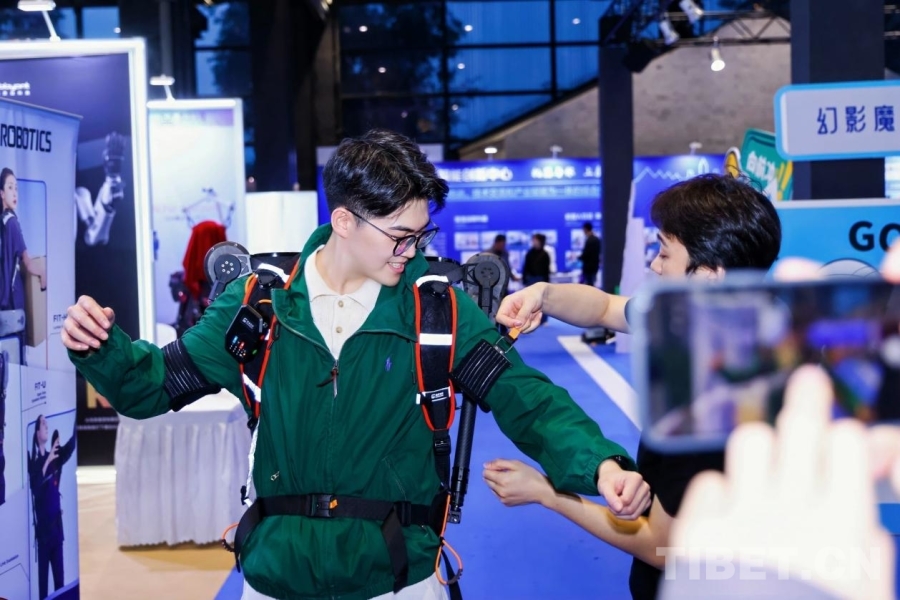 圖為游客們正在體驗能夠輔助提升運動表現的智能穿戴設備。