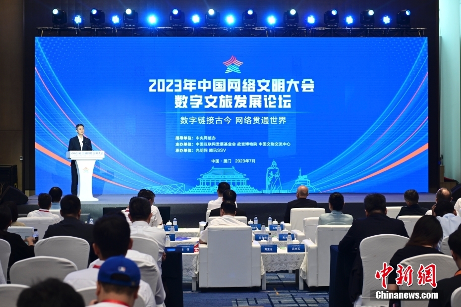 7月19日,2023年中國網(wǎng)絡(luò)文明大會數(shù)字文旅發(fā)展論壇在福建省廈門市舉辦。論壇以“數(shù)字鏈接古今 網(wǎng)絡(luò)貫通世界”為主題,邀請國內(nèi)外數(shù)字化、文博考古、旅游等領(lǐng)域?qū)<液痛砉餐剿鞴偶奈镌跀?shù)字時代的創(chuàng)造性轉(zhuǎn)化和創(chuàng)新性發(fā)展,以及在數(shù)字技術(shù)賦能下,文旅產(chǎn)業(yè)如何實現(xiàn)高質(zhì)量發(fā)展。圖為論壇現(xiàn)場。中新社記者 田雨昊 攝