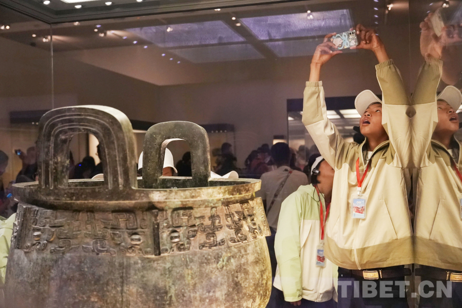 錯那學(xué)生丹增洛桑在國家博物館內(nèi)拍攝文物“盂”青銅鼎