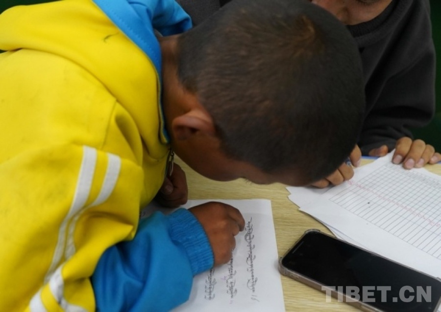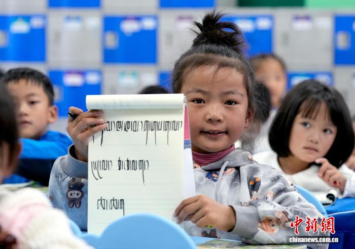 2025年9月1日,拉薩市第一小學一年級學生展示在藏語文課上學會的藏文。攝影:李林