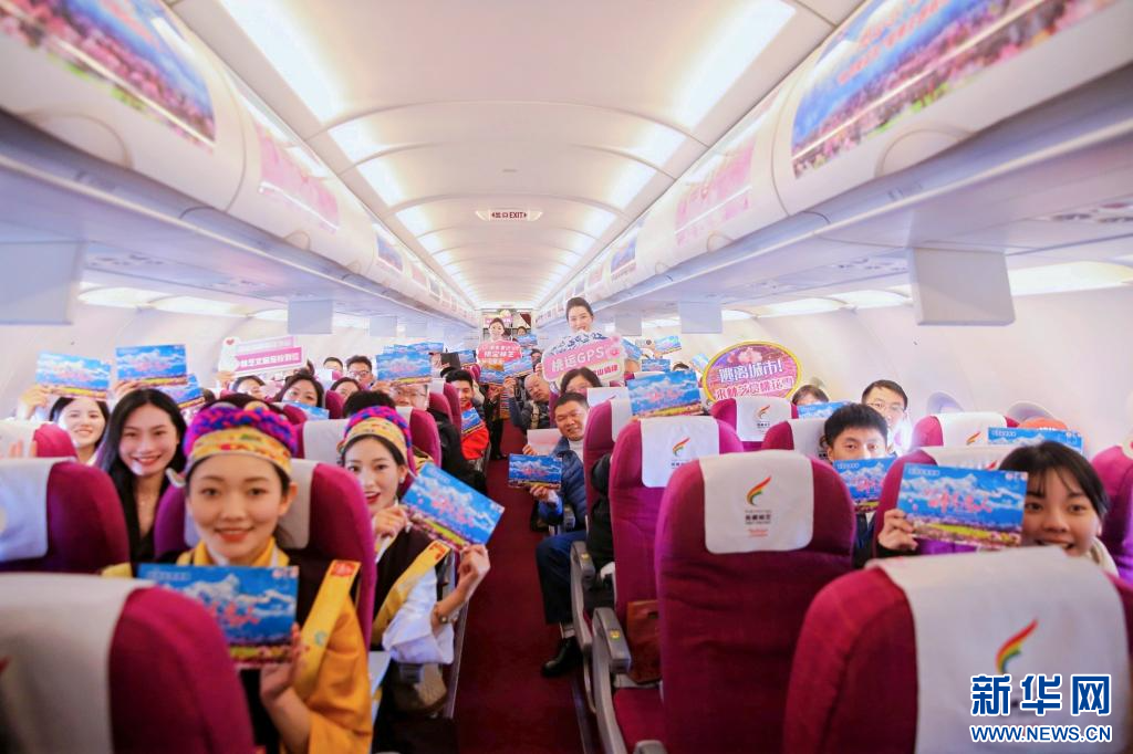 在首航旅途中,航班以“林芝桃花”為主題,載著來自全國各地的林芝“醉”美戀人、文旅達人、媒體代表及游客等100余人,開展了派發林芝來信、情侶云端告白、情歌合唱、首航蛋糕慶祝儀式等精彩互動環節,并通過桃花仙子云端文旅推介讓嘉賓和游客們對林芝滿懷憧憬。