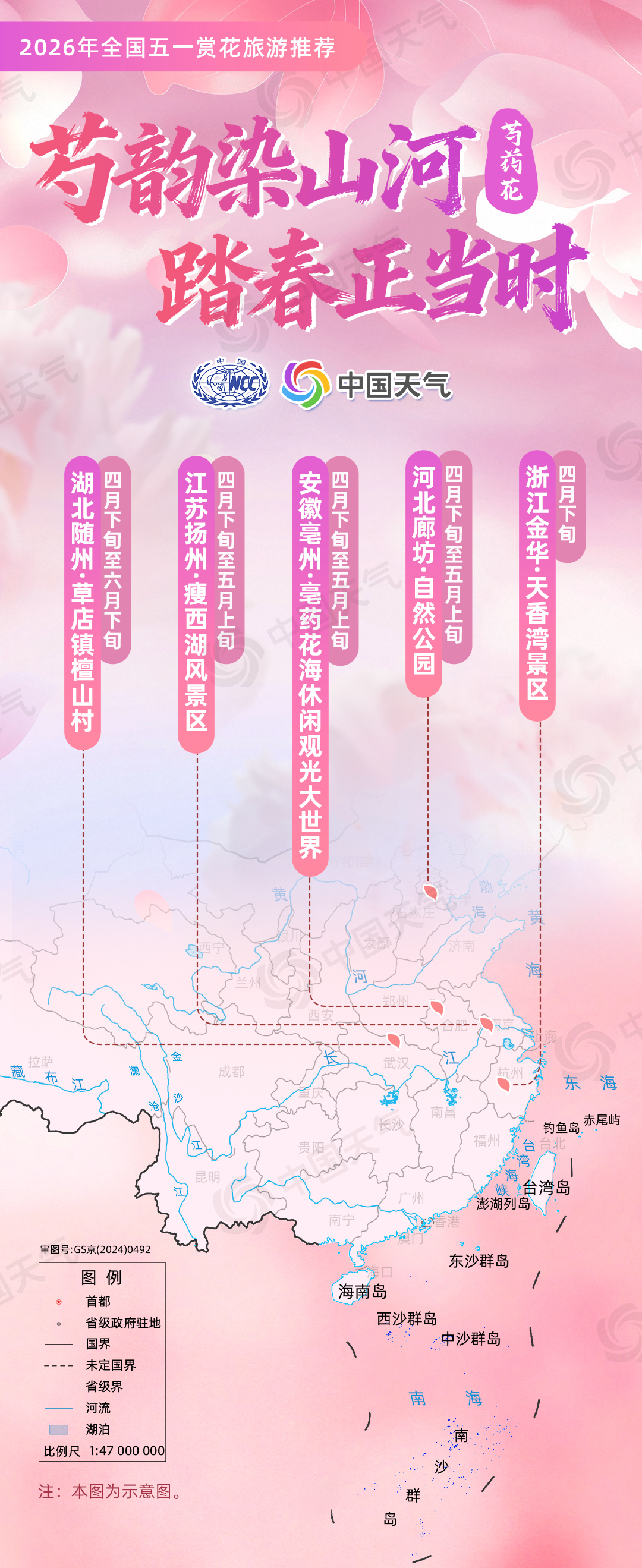 國家氣候中心聯合華風氣象傳媒集團結合賞花花品類型、盛開氣候條件、4月下旬至5月上旬氣候趨勢預測等,選出涵蓋6大類花品及10種特色花的全國賞花旅游景點作為推薦內容,涉及21個省(自治區(qū)、直轄市)的43個地市,包含東北、華北、西北、華中、華東、西南、華南等區(qū)域,并結合各地小氣候差異定向選點。